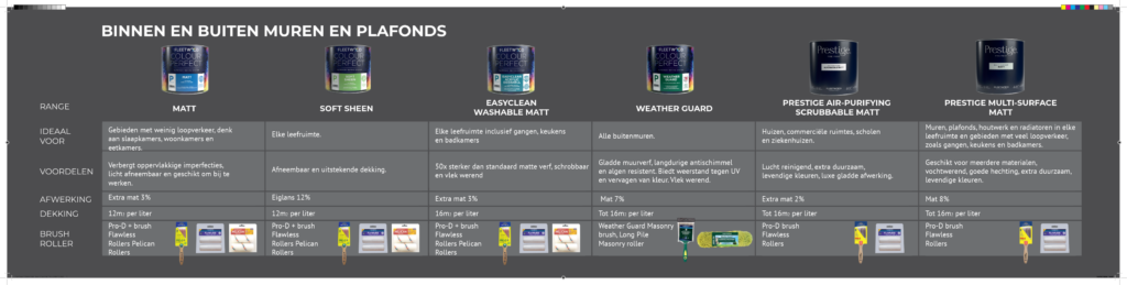 Of je nu werkt aan binnenmuren, plafonds, hout, metaal of buitenoppervlakken: elke kleur is gekoppeld aan een specifiek verfproduct met de juiste eigenschappen, zoals dekking, afwerking en duurzaamheid. Daarnaast zie je direct welke kwast of roller het beste resultaat garandeert. Dit voorkomt fouten, bespaart tijd en zorgt voor een efficiënte werkwijze.